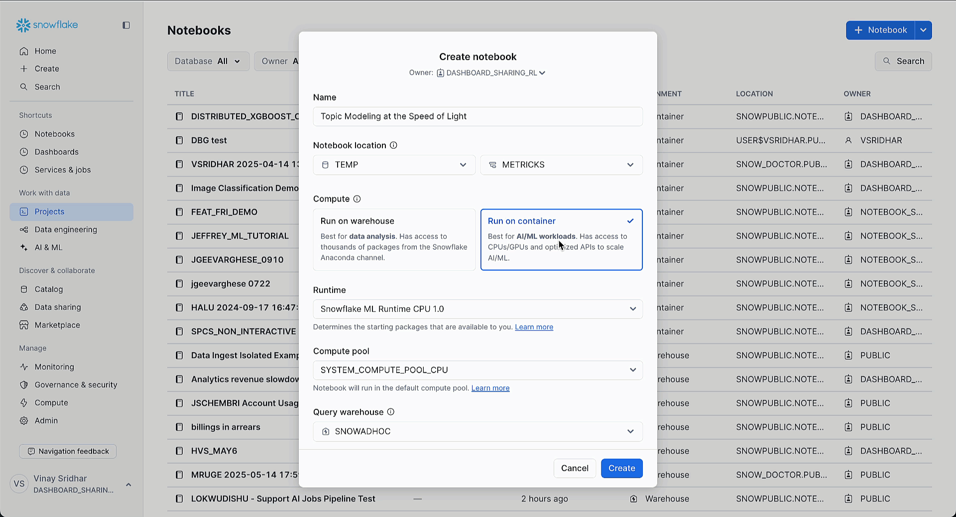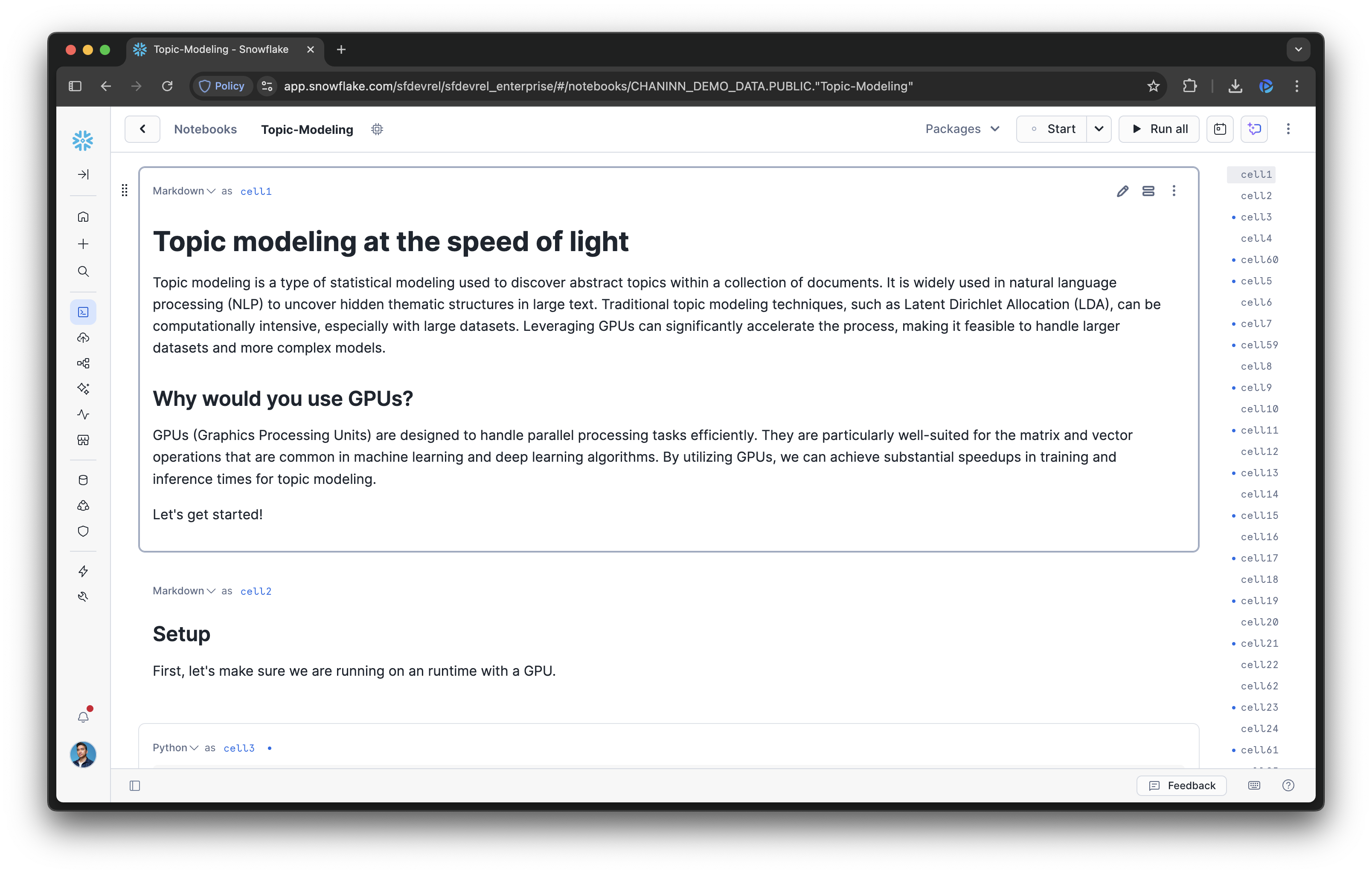 Topic modeling is a common text analysis technique, but it can be computationally expensive, especially with large datasets. The iterative nature of data science means that waiting hours for a single run is not practical. With NVIDIA CUDA-X libraries in Snowflake, you can achieve significant speed-ups with zero or near-zero code changes. This example demonstrates topic modeling on 500,000 book reviews, reducing the runtime from over 8 hours on a CPU to a few minutes on a GPU.