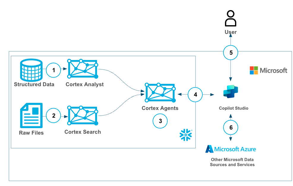 Using the two services together allows users to build a copilot in Microsoft with all of their Microsoft data and tooling alongside Snowflake Cortex services on top of their Snowflake data with efficiently and securely (with Oauth support).