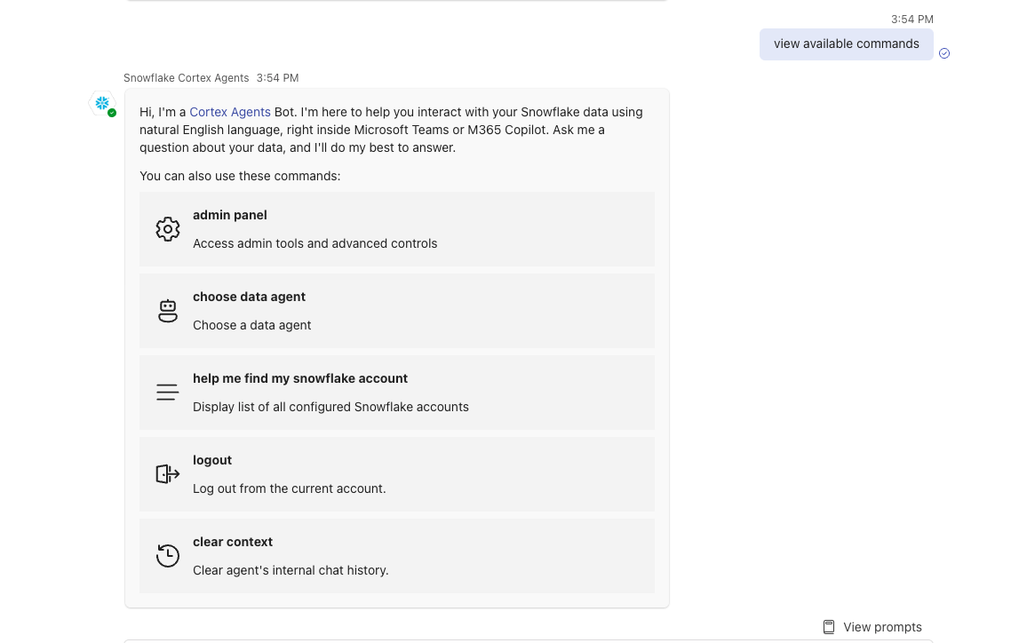 The Snowflake Cortex Teams and M365 App now supports the below functionality. Users are encouraged to expand on this use case to explore its complete functionality