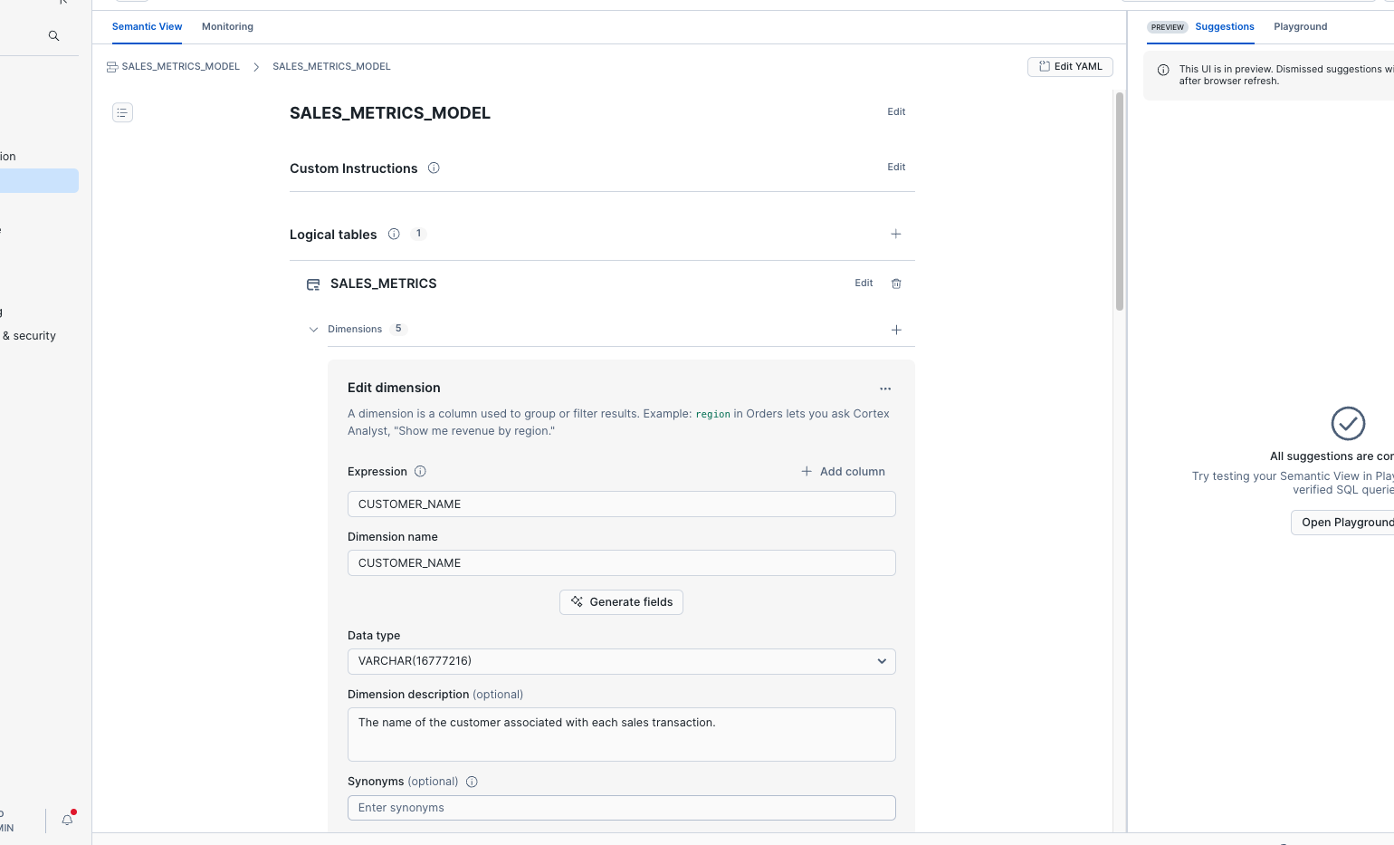 This is a VERY simple Analyst service. You can click through the dimensions and see that Cortex used LLMS to write descriptions and synonyms for each of the dimensions. We're going to leave this as-is, but know that you can adjust this as needed to enhance the performance of Cortex Analyst.